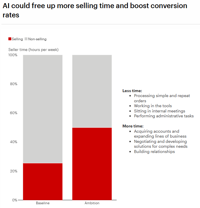 Research from Bain & Company found that sales professionals spend only 25% of their time actually selling. The rest goes to admin work, data entry, and research, and AI can be of help here.